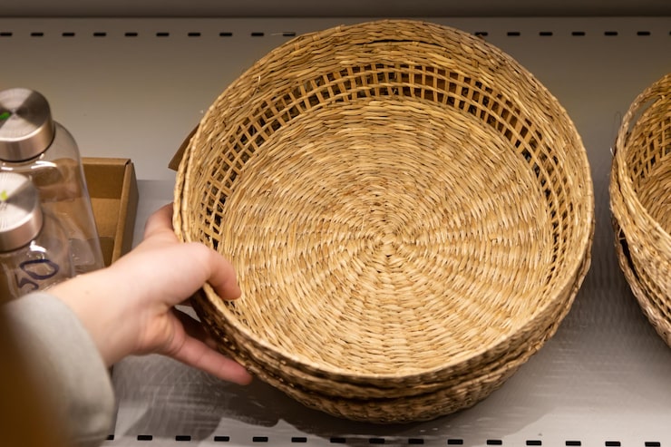 RixyКорзина круглой формы, изготовленная из плетеной травы, бежевого цвета, с ручками. Ее диаметр составляет 40 см, а высота – 47 см