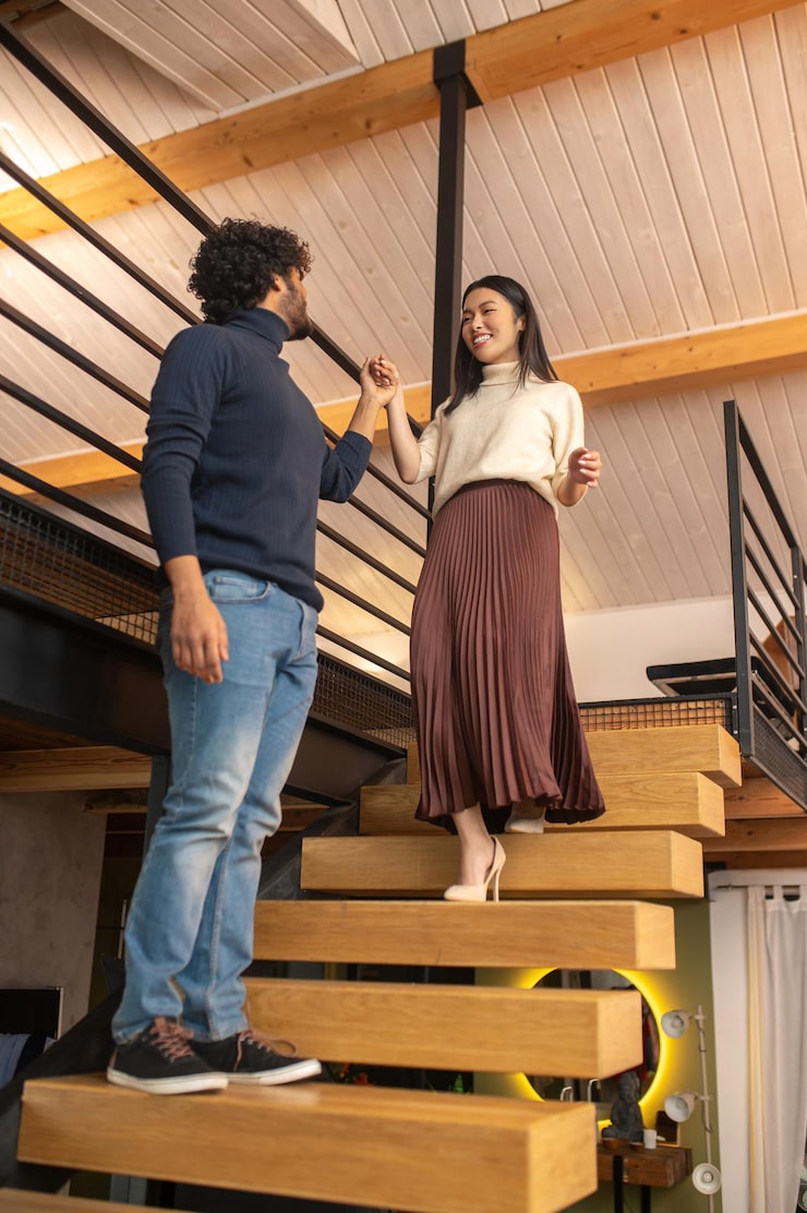 В планировке квартиры предусмотрено три лестницы: первая – из подвала в прихожую, вторая – между прихожей и гостиной, а также кухней, расположенными на первом этаже, и третья – соединяет первый и второй этажи. В рамках проекта была демонтирована стена, разделяющая лестничную площадку и гостиную, что обеспечило создание более просторной и освещенной комнаты. Оконные проемы были увеличены до уровня пола, и были установлены конвекторы.
