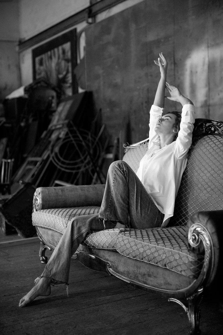 Особая деталь спальни, объединенной с гостиной, – подиум, расположенный в эркере. Увлечение заказчиков и дизайнера фактурой бетона привело к созданию бетонных ступеней, визуально парящих над полом, что позволило решить проблему использования ниши. С них открывается вид на Тверской бульвар и здание ТАСС, если расположиться в кресле. Органические очертания эркера перекликаются с дизайном кровати, бра и торшера, а также с керамическими изделиями Марины Новицкой и Елены Ореховой.