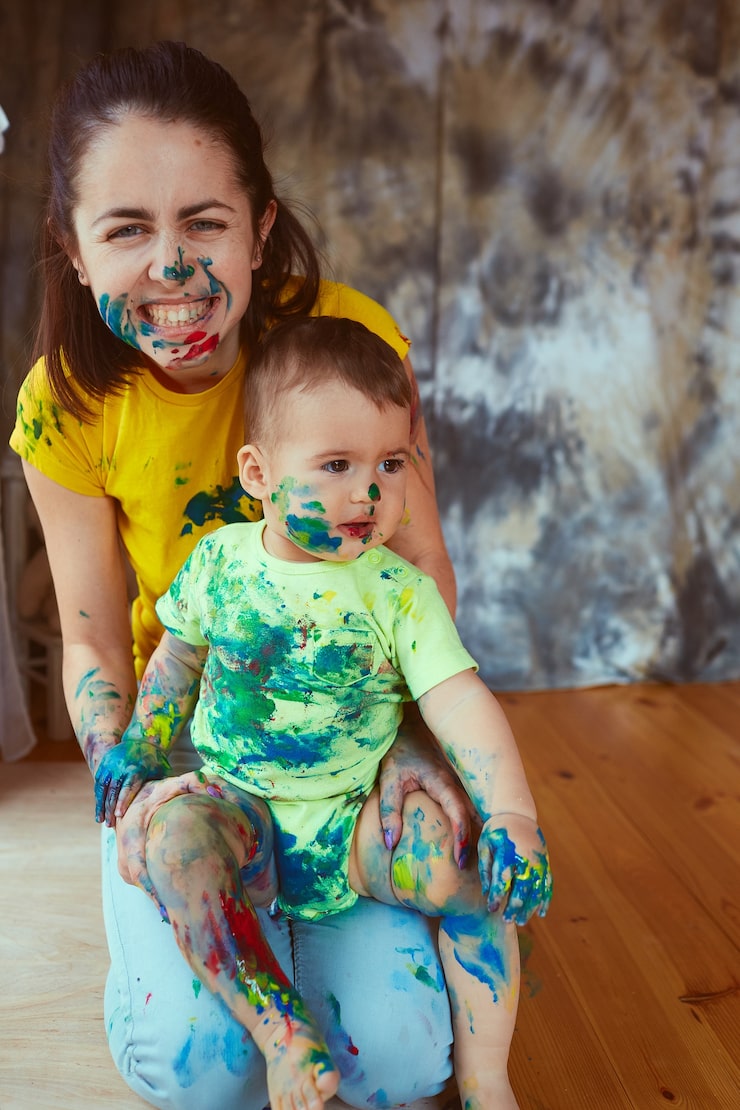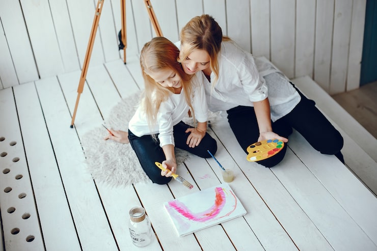 При определении цветовой палитры учитывались предпочтения заказчиков, желавших создать в квартире обстановку, отличающуюся от монотонных видов из окна. Стены и потолки были окрашены в насыщенные цвета. В коридоре и кухне-гостиной постелили кварцвиниловый ламинат, а в спальне и детской – виниловое покрытие.