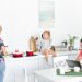 Изначально для кухни был запланирован диван в теплых оранжевых тонах, однако в нужный момент нужной ткани не обнаружилось. В конечном итоге выбор пал на диван насыщенного синего цвета, который гармонично сочетается с голубой полосой, проходящей по периметру комнаты. Белый комод, расположенный напротив дивана, – покупка ИКЕА, которую хозяйка привезла из своей предыдущей квартиры. Обеденный стол вместе со складными стульями и льняными подушками был приобретен на онлайн-платформах.