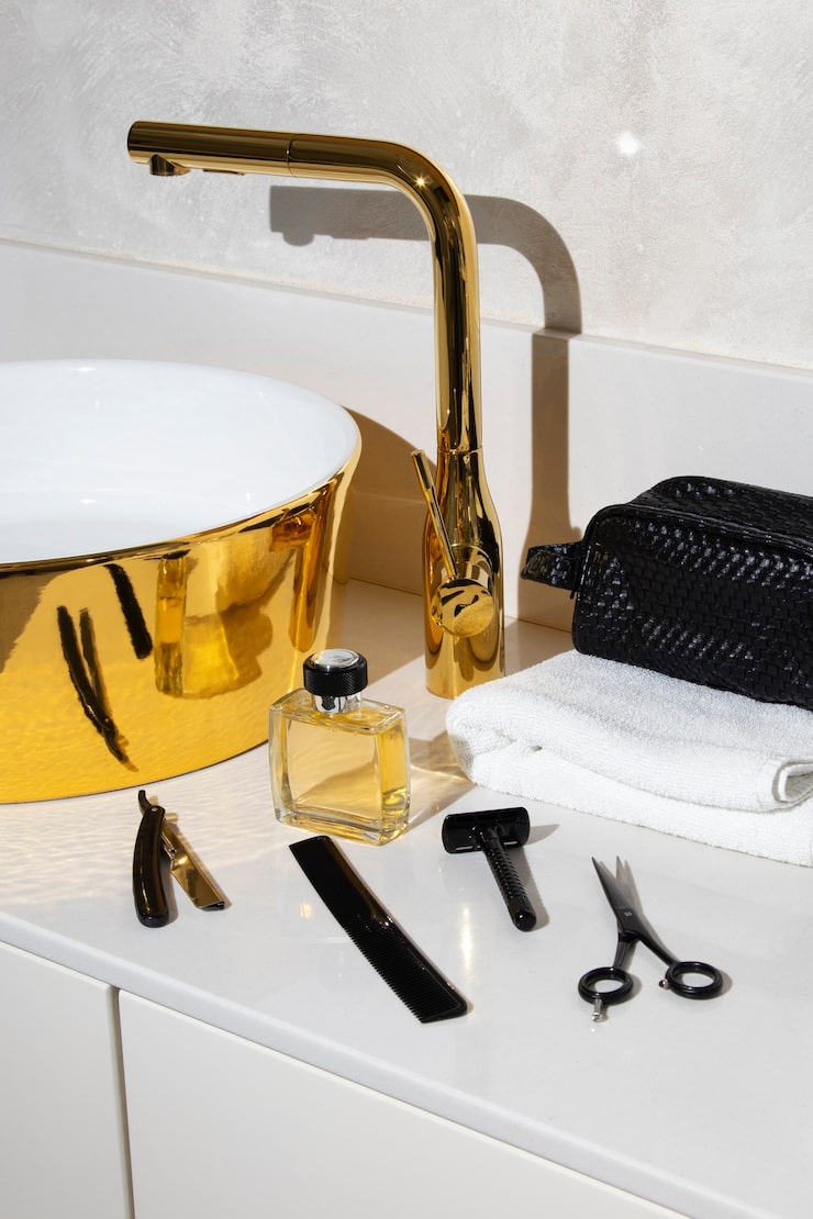Атмосферная подсветка зеркала и фасады тумбы с декоративными вставками из натурального ротанга создают гармоничный ансамбль. Фасады всех шкафов и кухонной мебели выполнены в единой стилистике, что придает интерьеру ощущение глубины и простора. Завершает композицию хрустальная раковина, служащая ярким акцентом.