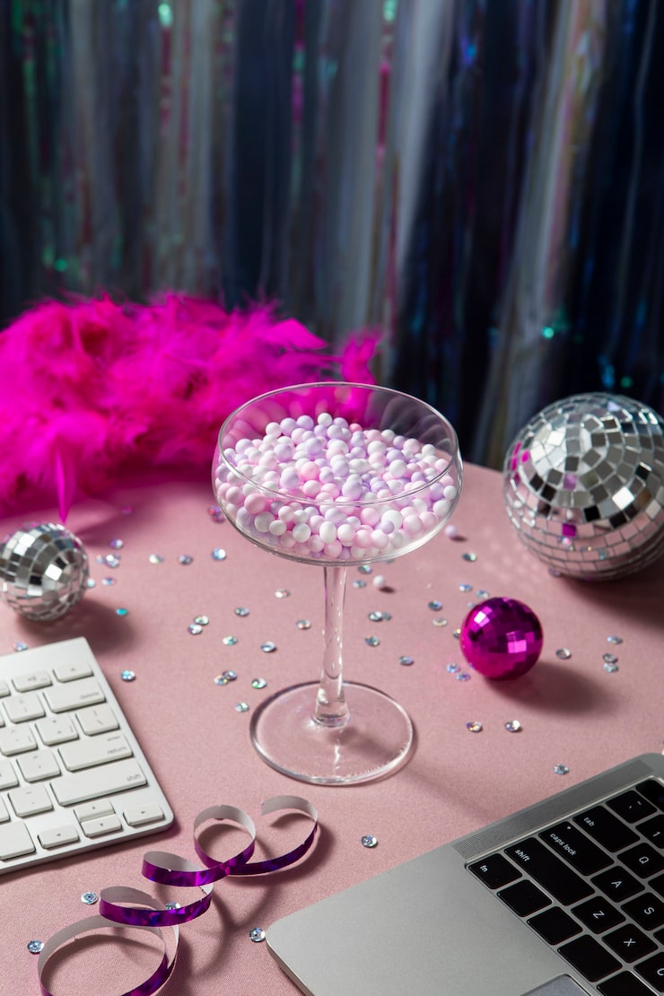 Небольшое количество клея и разноцветные блестки способны преобразить обычный бокал.
