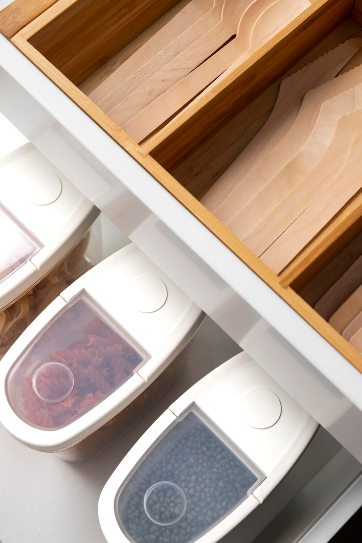 Для стиральной машины изготовили комод, дополненный столешницей из массива дуба. Поверхность столешницы покрыли несколькими слоями лака, что обеспечило её долговечность. Ремонт выполнен восемь лет назад, и столешница до сих пор выглядит безупречно. Фасады с дверцами также выполнены из массива дуба.
