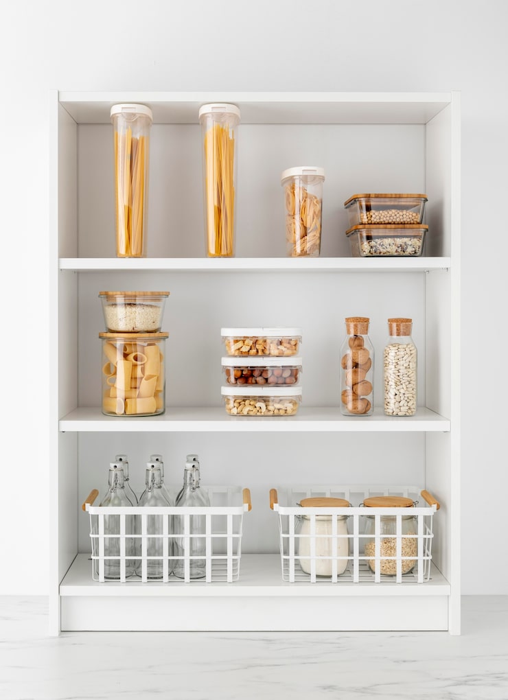 Шкаф предоставляет удобное пространство для хранения не только посуды, но и вытянутых коробок с макаронными изделиями и тестом. Добавление вертикального органайзера на дверцу позволит максимально эффективно использовать доступное место.