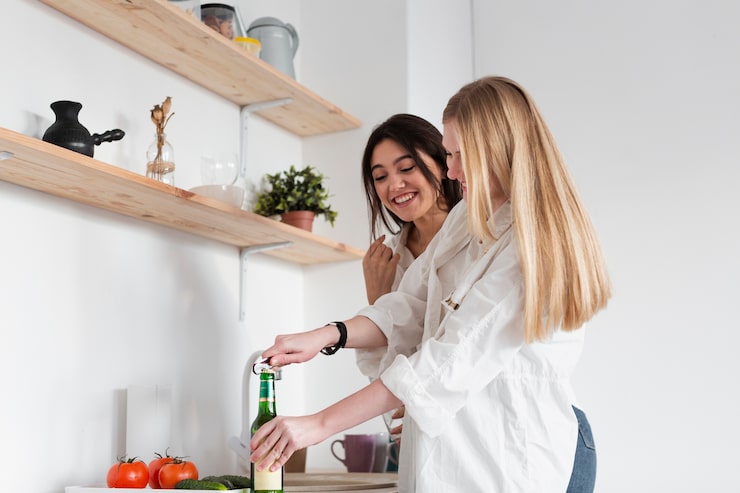 На верхние полки кухонного гарнитура рекомендуется размещать предметы, которые используются нечасто. Например, это могут быть корзины с алкогольными напитками или посуда, предназначенная для приготовления блюд на праздники.