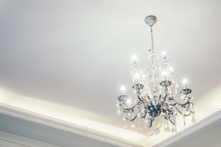 Люстра на потолке — самый доступный вариант освещения, но в современных интерьерах встречается редко. Это касается только люстр из недорогого и среднеценового сегмента; дорогие модели с множеством лампочек не относятся к бюджетному освещению. Ее можно устанавливать как с натяжным, так и с обычным белым потолком.