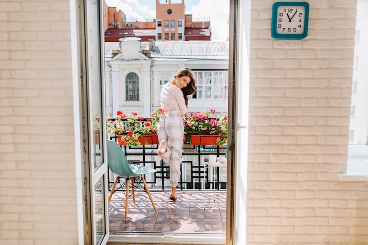 Хозяйка планировала использовать лоджию для отдыха с друзьями и иногда для работы, поэтому было решено оформить интерьер максимально ярко и насыщенно. Для этого стены и потолок в зоне с диваном покрасили в солнечный желтый цвет. Также здесь установили декоративные рейки. Сочетание желтой краски и натурального дерева создает очень уютную атмосферу.