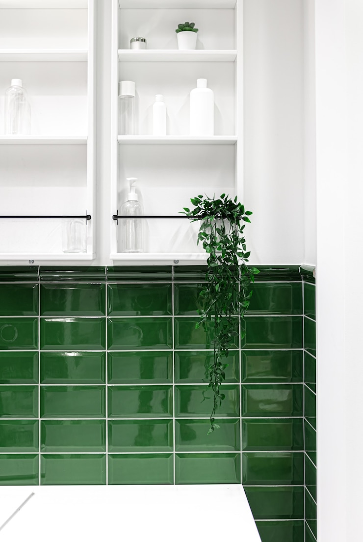 Оформление квартиры: зеленые стены, белая кухня и черный фартук