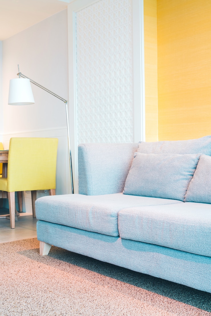 использовать всего лишь два акцента: диван канареечного цвета в гостиной и кресло цвета лайма в спальне. Получилось свежо и необычно.