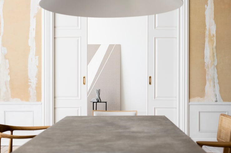 Для возведения стен гардеробной и санузла использовали газоблоки, которые затем оштукатурили и покрасили. Над частью помещения установлен подвесной потолок из гипсокартона, скрывающий канальный кондиционер и инженерные коммуникации. Пол прихожей, санузла, гардеробной и кухни облицован керамогранитом, визуально имитирующим венецианский цементный пол с каменной крошкой, то есть терраццо. В спальне и гостиной уложены доски инженерной доски увеличенной ширины.
