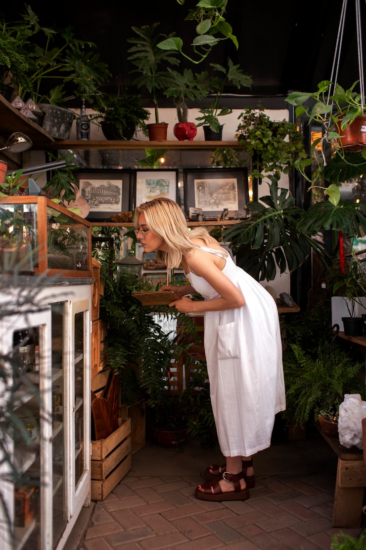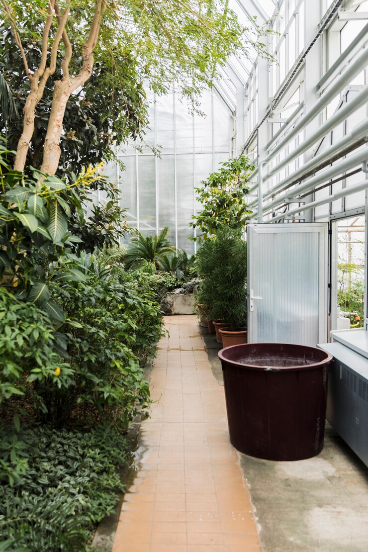 Санузел оформлен так, чтобы максимально передать атмосферу настоящей оранжереи. Стеновые покрытия — моющиеся обои с растительным рисунком и оригинальная конструкция, напоминающая двери в оранжерею. Все створки открываются, что позволяет провести тщательную уборку. Конструкция оборудована закарнизной подсветкой. Остальные поверхности выложены популярной плиткой терраццо, а потолок окрашен в зеленый цвет.